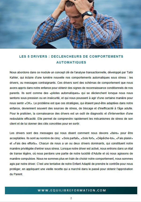 Vous découvrirez les cinq drivers, leur origine dans les messages parentaux et leurs effets sur la vie adulte. Les exercices d’application vous apprendront à reconnaître, réguler et assouplir ces contraintes internes afin de favoriser des comportements plus libres.