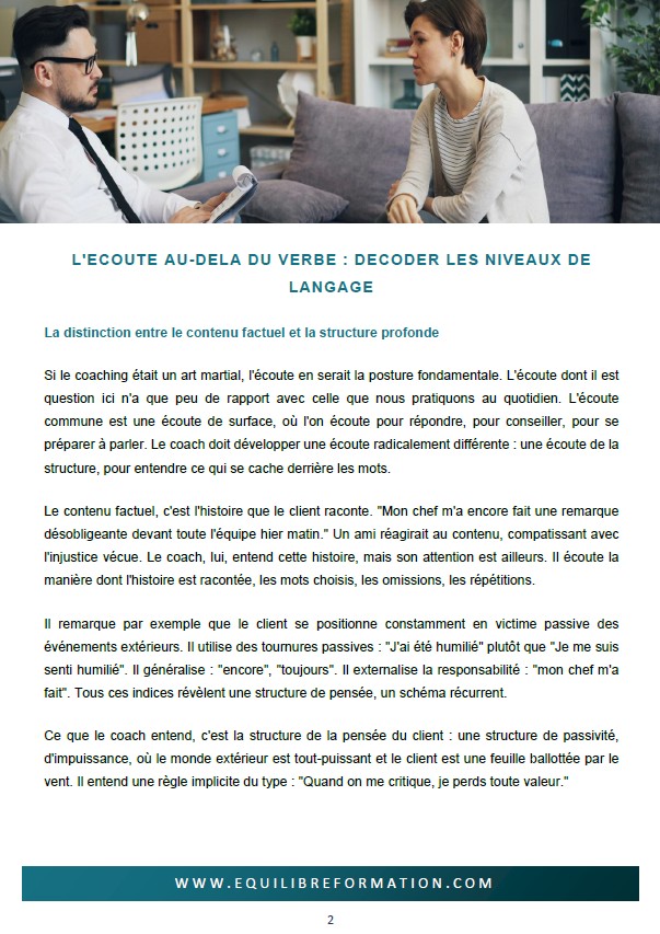 🎯 Résultat : vous maîtrisez l’écoute tridimensionnelle, permettant à vos clients de se sentir compris en profondeur et d’ouvrir la voie à une transformation sincère.