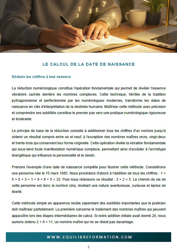Vous maîtriserez la réduction numérologique, le calcul du chemin de vie, des années et des mois de naissance, ainsi que la lecture des subtils nombres maîtres. Ce module vous montre comment chaque chiffre révèle une vibration unique, véritable empreinte énergétique de la personnalité