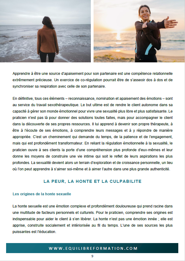 Vous explorerez le lien entre émotions et sexualité, notamment la peur, la honte et la culpabilité, ainsi que leur influence sur le vécu intime. Ce module vous apprend à restaurer un sentiment de sécurité émotionnelle indispensable au changement.